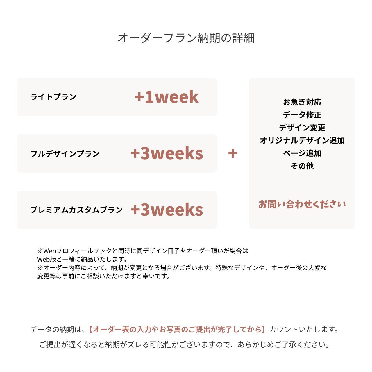 6週間を過ぎてからのご注文は「お急ぎ対応」となり、+10,000円の追加料金をいただいております。余裕を持ってのご注文・ご提出にご協力をお願いいたします。